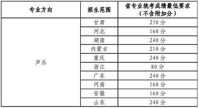 只招收美聲和民族唱法的考生。考生自身身心健康狀況不影響專業(yè)表演、演唱和學(xué)習(xí),無發(fā)聲器官疾病,符合《普通高等學(xué)校招生體檢工作指導(dǎo)意見》及有關(guān)補(bǔ)充規(guī)定要求。