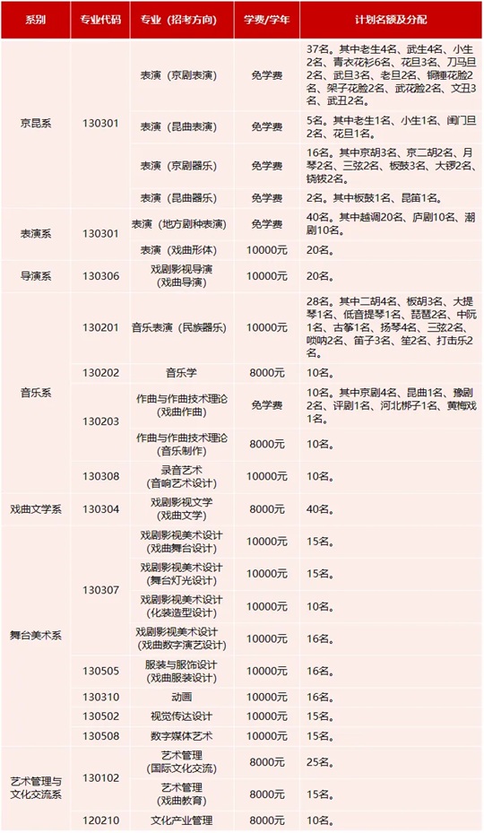 1.京昆系、表演系、導演系所有專業和作曲與作曲技術理論(戲曲作曲)專業不編制分省計劃,使用戲曲類專業省際聯考成績作為專業成績進行錄取。