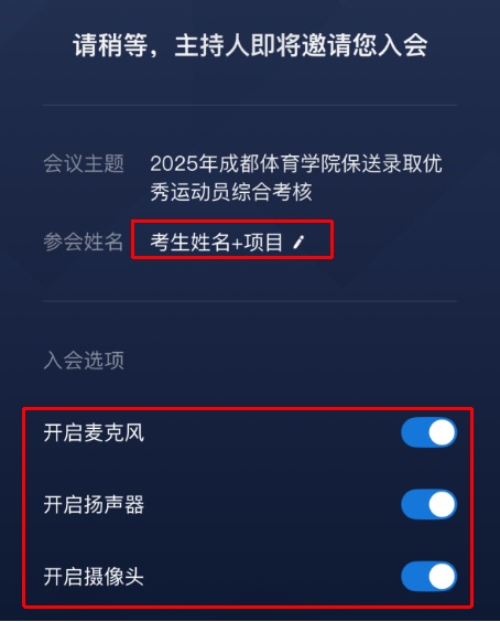 2.考生輸入會(huì)議號(hào)進(jìn)入等待界面,在此界面將參會(huì)姓名修改成:考生姓名+項(xiàng)目,并開啟音頻和視頻(如圖一)。