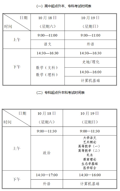 高中起點的語文、數學、外語(外語科目語種分英語、日語)、理化、史地,考試時間均為120分鐘;計算機基礎考試時間為90分鐘。各科目滿分均為150分。