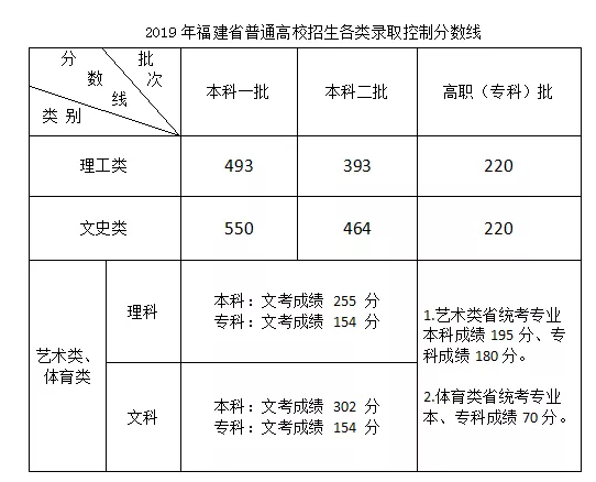 2019年福建省普通高校招生各類錄取控制分數線公布