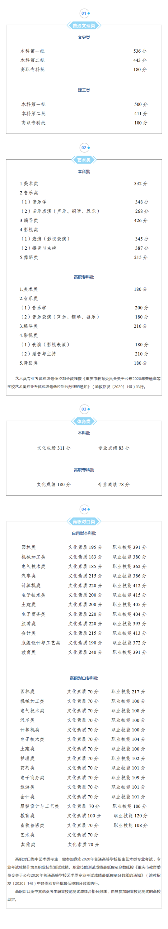 | 重慶市2020年全國(guó)普通高校各類(lèi)招生錄取最低控制分?jǐn)?shù)線出爐 |