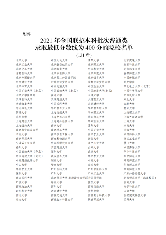 附件:2021年全國聯招本科批次普通類錄取最低分數線為400分的院校名單