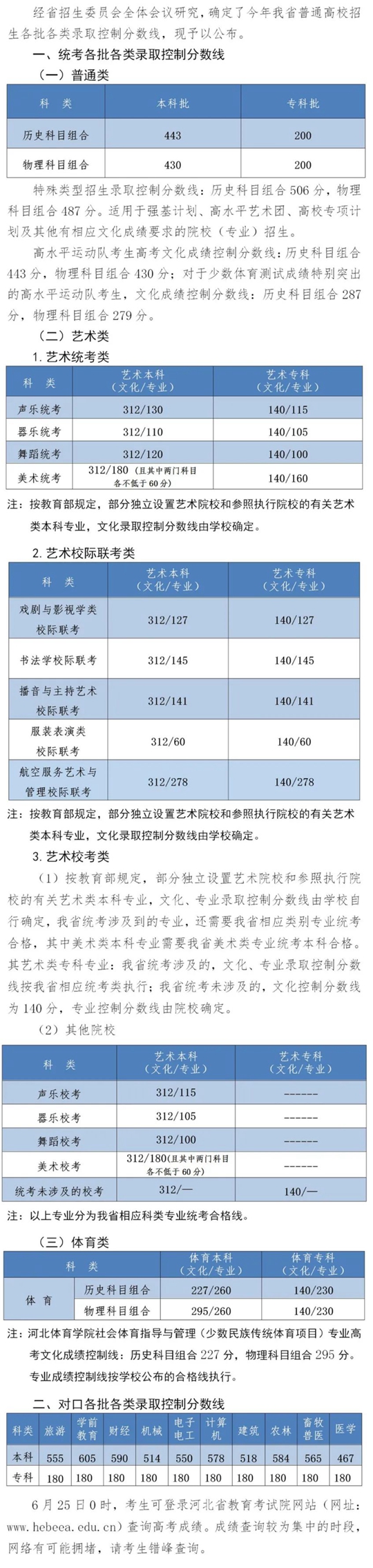 2022年河北省普通高校招生各批各類錄取控制分數線