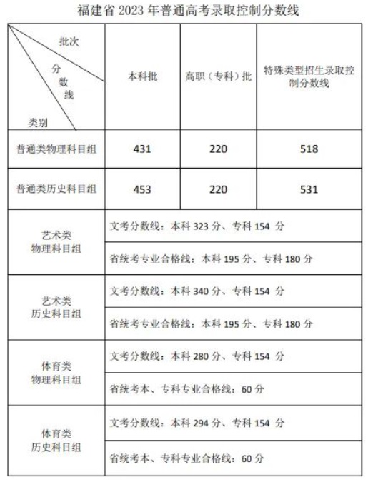 | 福建省2023年普通高考錄取控制分數線 |