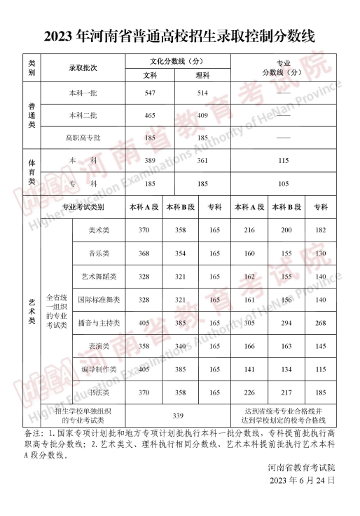 | 2023年河南省普通高校招生錄取控制分?jǐn)?shù)線 |
