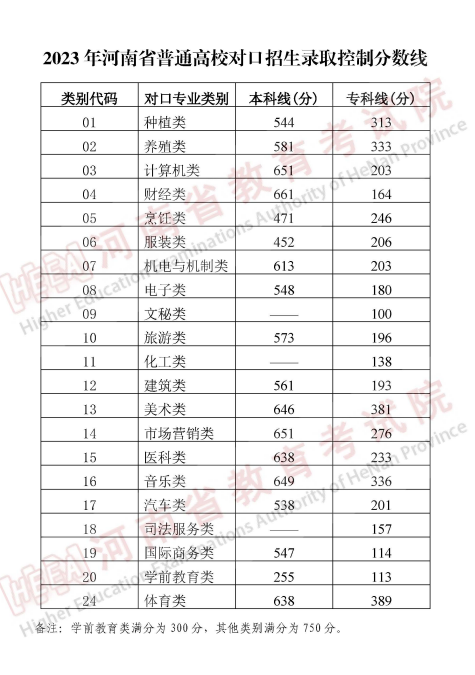 二、2023年河南省普通高校對(duì)口招生錄取控制分?jǐn)?shù)線