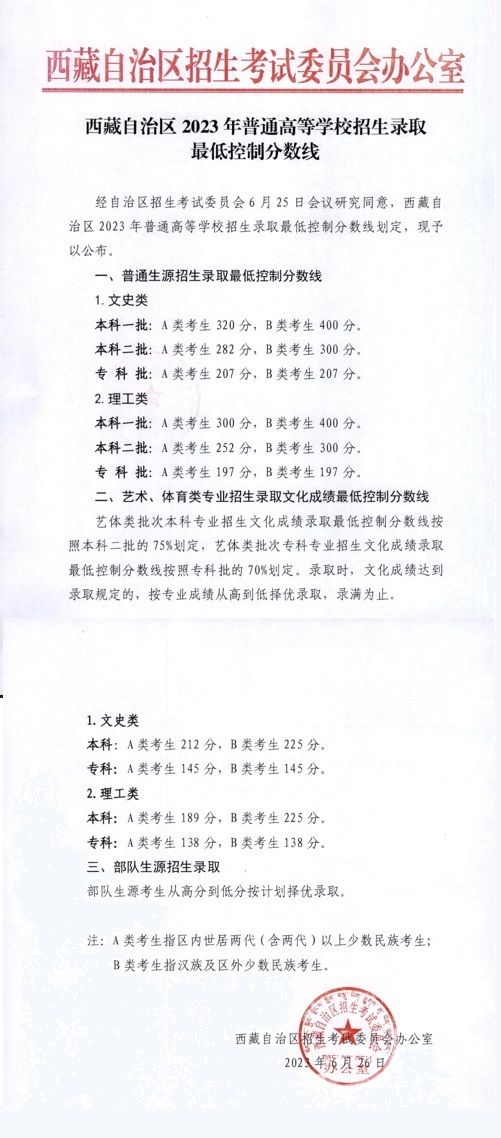 西藏:2023年高考錄取最低控制分數線