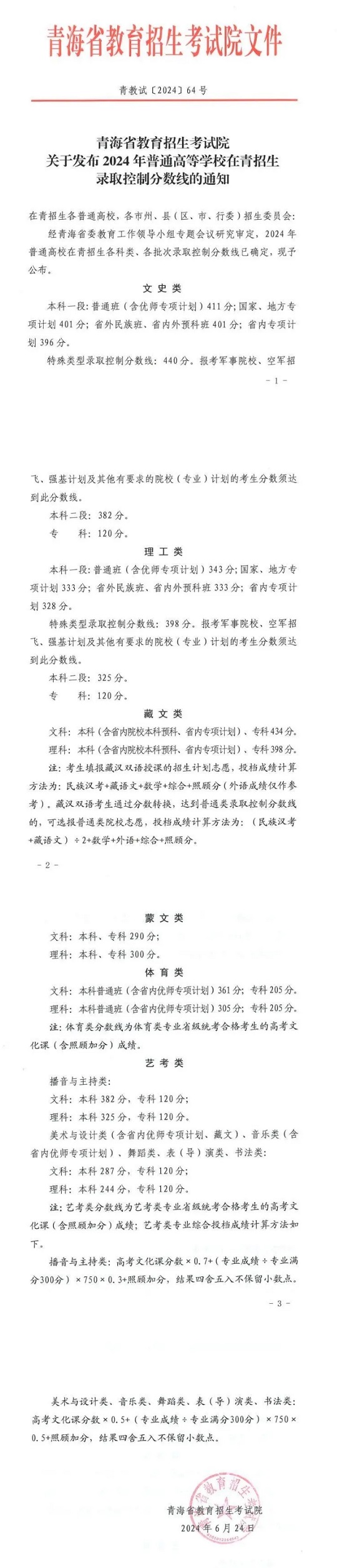 青海省教育招生考試 院關于發布2024年普通高等學校在青招生錄取控制分數線的通知