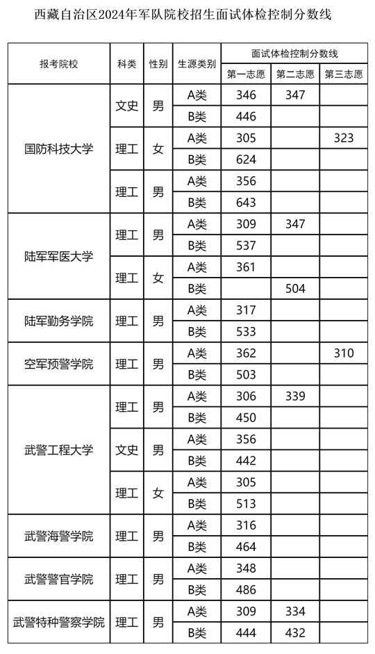 根據(jù)中華人民共和國(guó)教育部,中央軍委政治工作部、中央軍委訓(xùn)練管理部《關(guān)于印發(fā)<2024年軍隊(duì)院校招收普通高中畢業(yè)生計(jì)劃>的通知》規(guī)定,結(jié)合考生報(bào)考軍隊(duì)院校實(shí)際情況,西藏軍區(qū)招生工作辦公室會(huì)同西藏自治區(qū)教育考試院按照相關(guān)規(guī)定,按比例劃定參加2024年軍隊(duì)院校在藏招收普通高中畢業(yè)生面試體檢控制分?jǐn)?shù)線(具體如下)。請(qǐng)上線考生按前期公告要求到指定地點(diǎn)參加面試體檢。