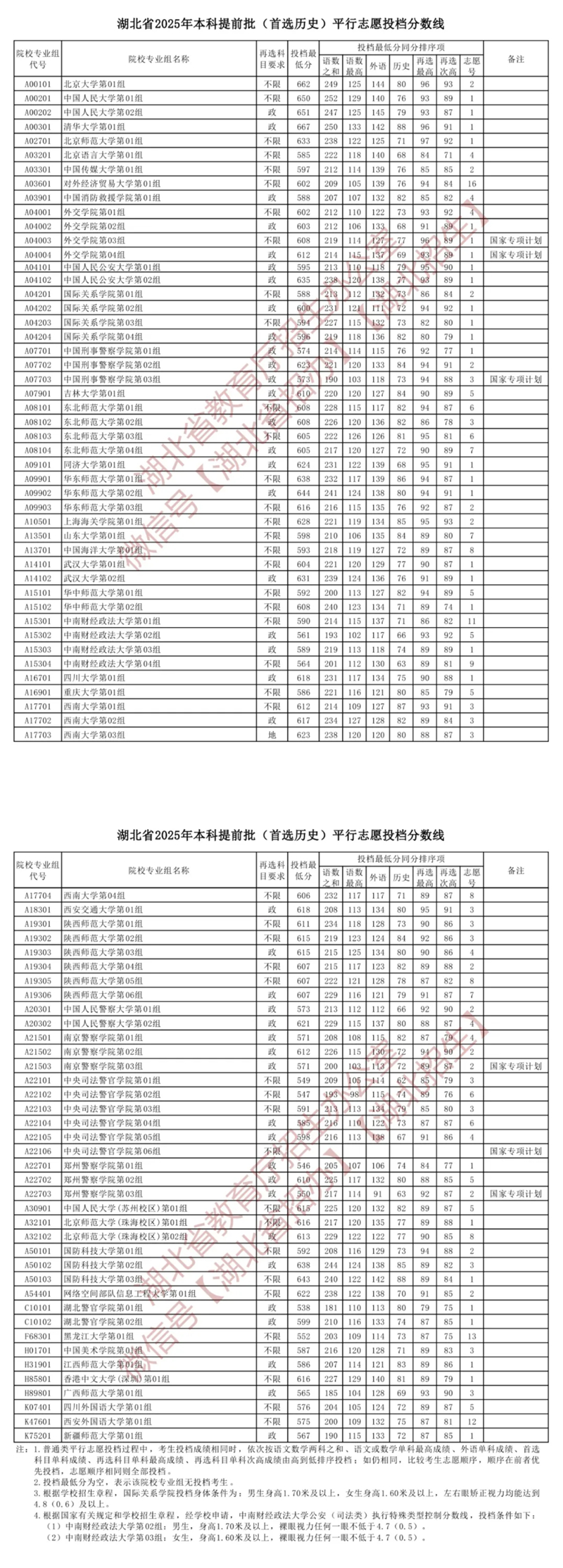 湖北省2025年本科提前批(首選歷史)平行志愿投檔分數線
