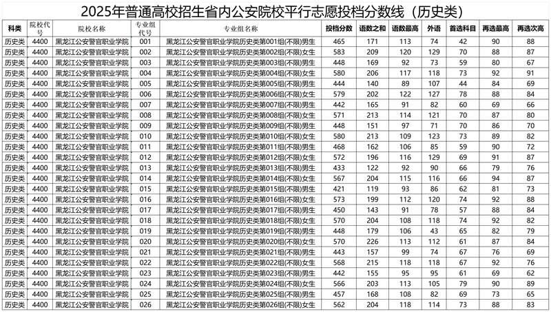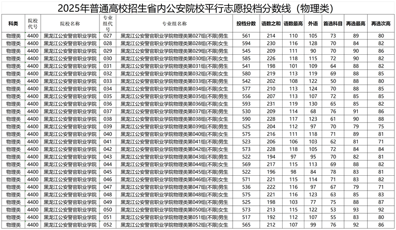 2025年黑龍江省普通高校招生提前批省內公安院校于7月17日進行平行志愿投檔,現公布院校專業組投檔分數線。