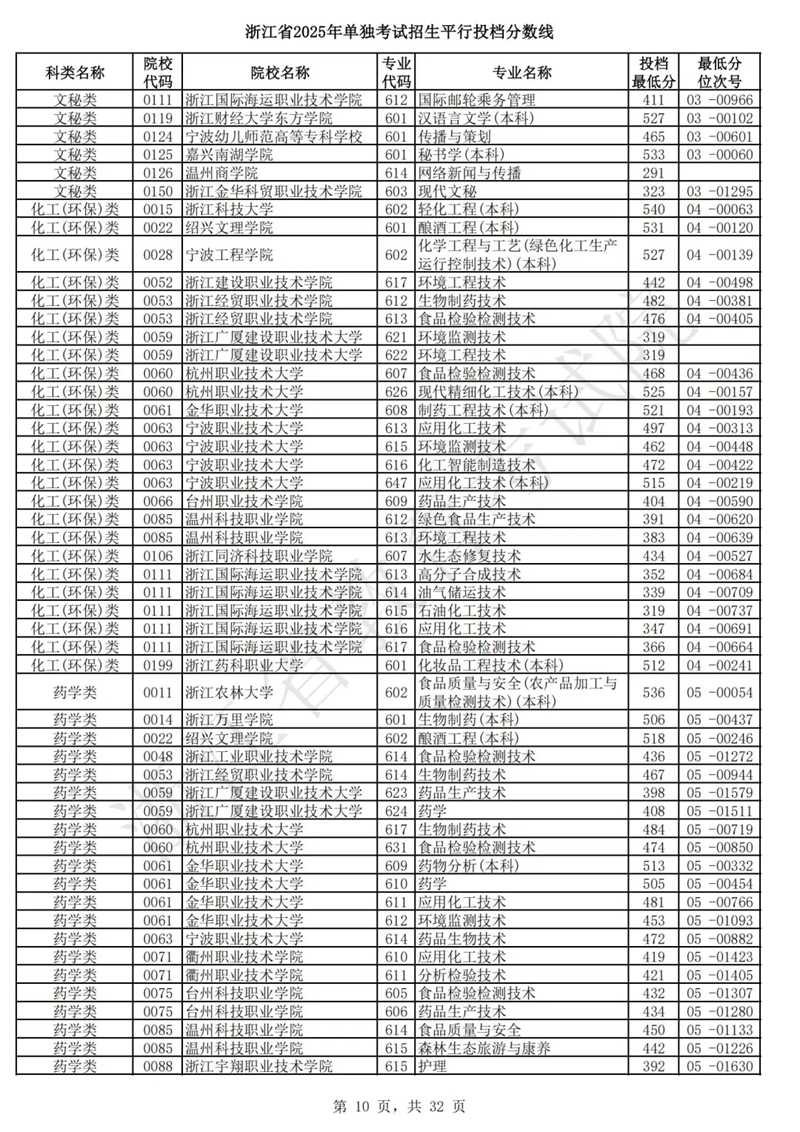 | 浙江省2025年單獨考試招生平行投檔分數線 |