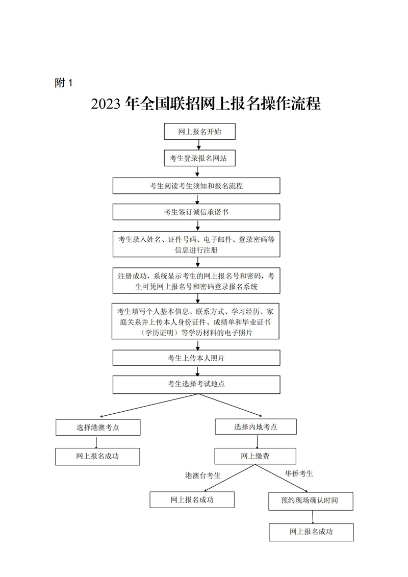 所有考生均須在上述規定時間內登錄系統,按要求進行注冊,輸入報考信息,上傳本人照片、身份證件及學歷資料電子照片,選擇考試地點。考試地點一旦提交,包括但不限于個人信息、考試地點等內容,均不得再進行修改。內地考點考生還須完成網上繳費,華僑考生須預約現場確認報名時間,逾期不再受理。網上報名成功后,報名狀態顯示為“待確認”。網上報名流程見附1。