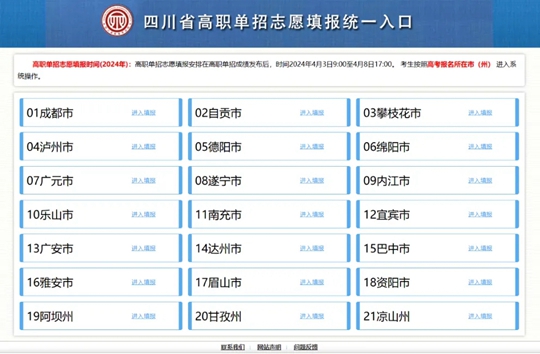 考生登錄四川省教育考試院官網,可點擊圖1中“四川省2024年高職單招系統入口”或“2024年高職單招專欄”進入高職單招信息管理系統志愿填報統一入口頁面,考生按照高考報名所在市(州)進入系統進行志愿填報,如圖2: