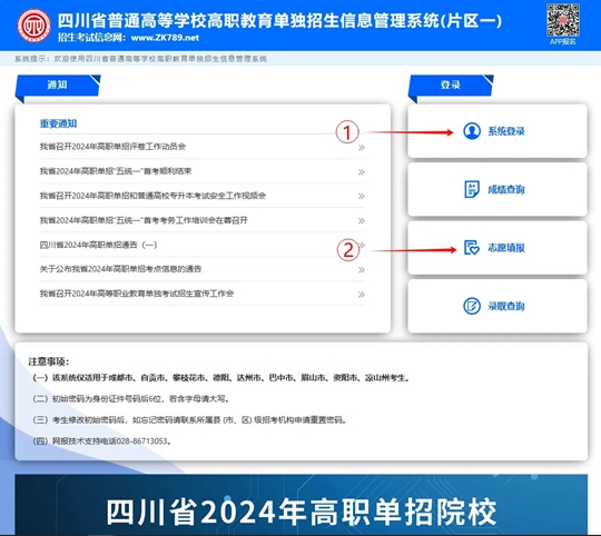 考生可點擊圖3中標記①“系統登錄”或通過標記②“志愿填報”進入登錄頁面。