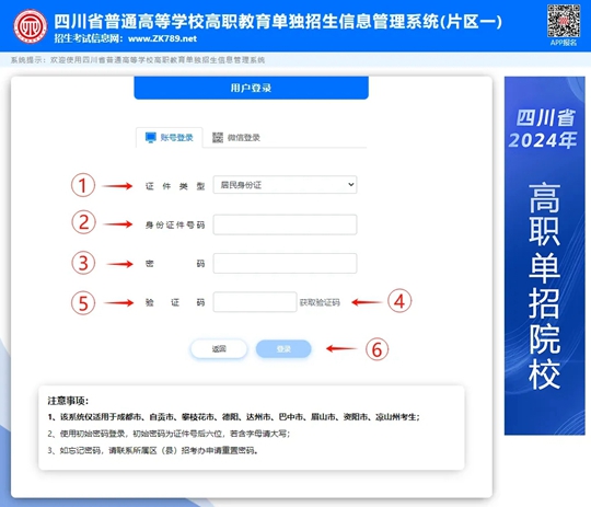 依次在圖4中標記①選擇證件類型,在標記②正確填寫身份證件號碼,在標記③正確填寫密碼,點擊標記④“獲取驗證碼”獲取驗證碼圖片,在標記⑤正確輸入驗證碼圖片中的4位驗證碼,待標記⑥“登錄”按鈕可用后點擊“登錄”按鈕,進入系統。