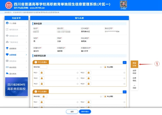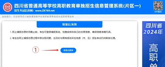 仔細閱讀圖16填報后須知內容后,可點擊標記①“查看志愿表”按鈕進入查看志愿頁面。查看志愿頁面如圖17所示。