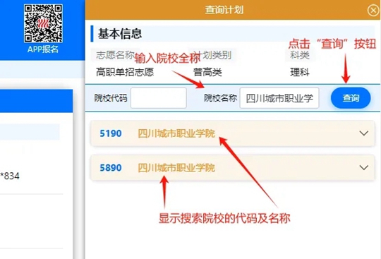 在圖13中點擊標記①院校標題,展開當前院校的專業代碼和專業名稱。點擊標記②左右翻頁按鈕查看當前院校的所有專業代碼及專業名稱。