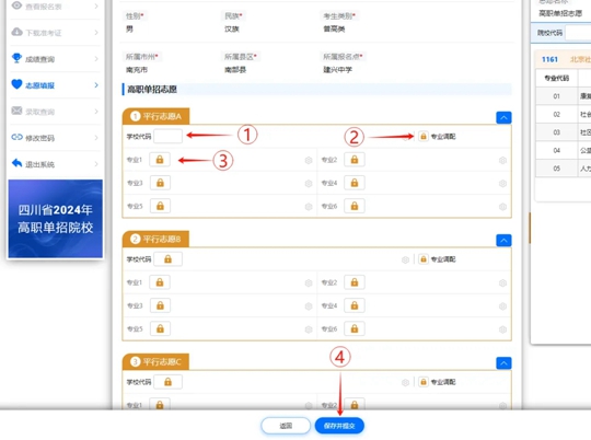 根據查詢到的計劃信息,在圖14填寫志愿頁面中填寫志愿信息。依次填寫標記①學校代碼,選擇是否勾選標記②專業調配(勾選表示服從專業調配,不勾選表示不服從專業調配),再依次填寫標記③專業代碼,其他平行志愿填寫以此類推。填寫完成后,點擊下方標記④“保存并提交”按鈕,保存并提交當前志愿。
