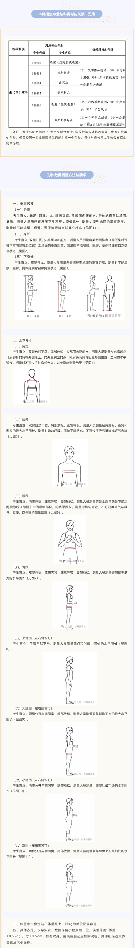 1.形體形象觀測考試目的:主要考查考生形體比例、肢體的勻稱性、協(xié)調性及膚質等方面狀況,評價考生專業(yè)外部條件及形象氣質等?荚囆问脚c要求:考生先完成形體測量(測量方法與要求見附件),然后5——10人一組進行正面、側面、背面體態(tài)展示。要求赤足、著泳裝,其中女生著純色、分體、不帶裙邊泳裝,男生著純色泳褲。