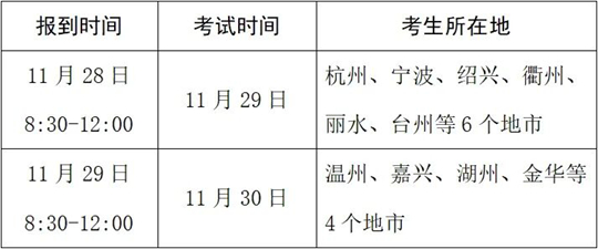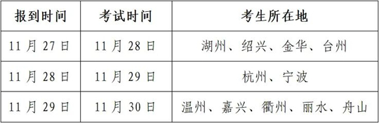 本次考試時間為11月28日—30日,按地區(qū)分三批在金華職業(yè)技術(shù)大學(xué)進行。考生須于考試前一天,持本人身份證到組考學(xué)校辦理報到手續(xù),填寫考點規(guī)定的表格,領(lǐng)取準考證,了解考試安排情況。報到地點見金華職業(yè)技術(shù)大學(xué)招生網(wǎng)(https://zsw.jhc.edu.cn)通知。具體時間安排如下: