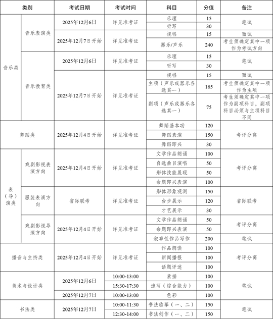 自治區2026年普通高等學校招生藝術類專業統考科目及時間表