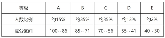 思想政治、地理、化學、生物學4門科目每科原始成績滿分為100分,等級賦分以30分作為賦分起點,滿分為100分。轉換時將考生原始成績從高到低劃分為A、B、C、D、E共5個等級,各等級人數所占比例分別約為15%、35%、35%、13%和2%。將A至E等級內的考生原始分,按照確定比例,依照轉換公式,分別轉換到100——86、85——71、70——56、55——41、40——30五個分數區間(具體見下表),四舍五入取整后得到考生的等級分。經過轉換,考生在相應科目群體中的位次不會下降。每科計算等級轉換的考生人數即轉換基數,具體為實際參加該科目考試并取得有效成績的人數。