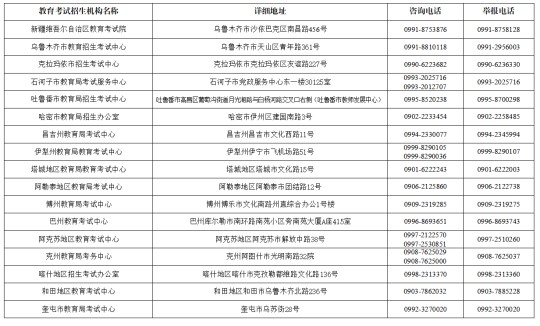 考生可登錄新疆教育考試院官方網(wǎng)站查看《關于印發(fā)〈自治區(qū)2025年普通高等學校招生體育類專業(yè)測試工作方案〉的通知》,詳細了解自治區(qū)2025年普通高等學校招生體育類專業(yè)測試報考條件及相關要求,按時按要求完成網(wǎng)上報名。考生如有疑問,可撥打高考報名所在地教育考試招生機構咨詢電話(詳見下表)咨詢。