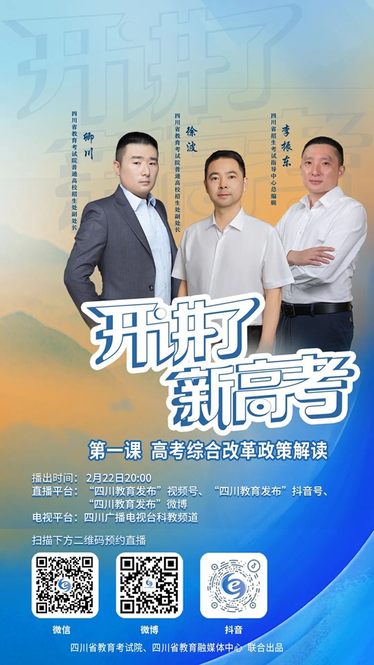 2025年,我省全面實(shí)施高考綜合改革,普通高校將按照全新的考試招生模式錄取新生。為了幫助廣大考生、家長了解考試安排、批次設(shè)置、志愿填報(bào)、投檔錄取等關(guān)鍵環(huán)節(jié)的相關(guān)政策規(guī)定,四川省教育考試院、招生考試指導(dǎo)中心、教育融媒體中心聯(lián)合推出《開講了新高考》系列公開課,深度解析《四川省2025年普通高校招生考試和錄取工作實(shí)施方案》。