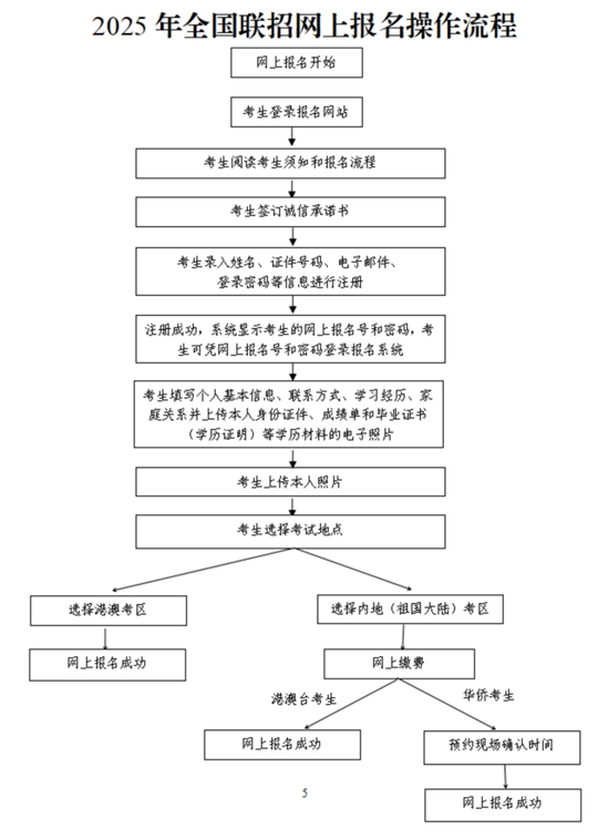 所有考生均須在上述規定時間內登錄系統,按要求進行注冊,輸入報考信息,上傳本人照片、身份證件及學歷資料電子照片,選擇考試地點。考試地點一旦提交,包括但不限于個人信息、考試地點等內容,均不得再進行修改。內地考點考生還須完成網上繳費,華僑考生須預約現場報名確認的時間,逾期不再受理。網上報名成功后,報名狀態顯示為“待確認”。網上報名流程詳見下方。