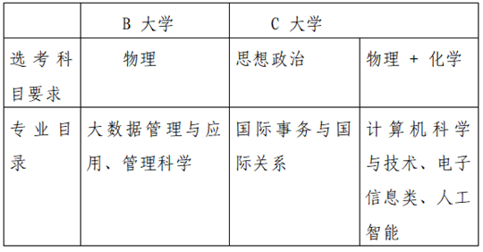 如果考生小亮的選擇性考試科目為物理、化學、地理,他可以填報“大數據管理與應用+B大學”,形成自己的1個“專業+院校”志愿。同時,小亮也可以填報“管理科學+B大學”“計算機科學與技術+C大學”“電子信息類+C大學”“人工智能+C大學”,作為自己的另外4個“專業+院校”志愿。