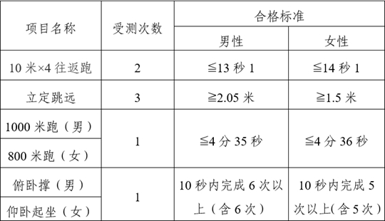 以上4個項目須全部進行測試,男生1000米跑、女生800米跑為必須合格的項目,另外3項需合格兩項。達到前述條件的考生體能測試結論為合格。