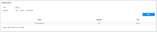 成績排名查詢界面系統(tǒng)為考生提供了成績排名查詢,通過點(diǎn)擊界面右下角的“搜索”按鈕,可查詢考生投檔分?jǐn)?shù)以及報考科類的順位排名,考生還可設(shè)置“再選科目”選項后,再次點(diǎn)擊右下角藍(lán)色的“搜索”按鈕,查詢在考生報考科類及相應(yīng)再選科目下的投檔分?jǐn)?shù)及順位排名。(注:院校排名查詢界面僅顯示考生報考科類相關(guān)排名,兼報科類排名不顯示。)