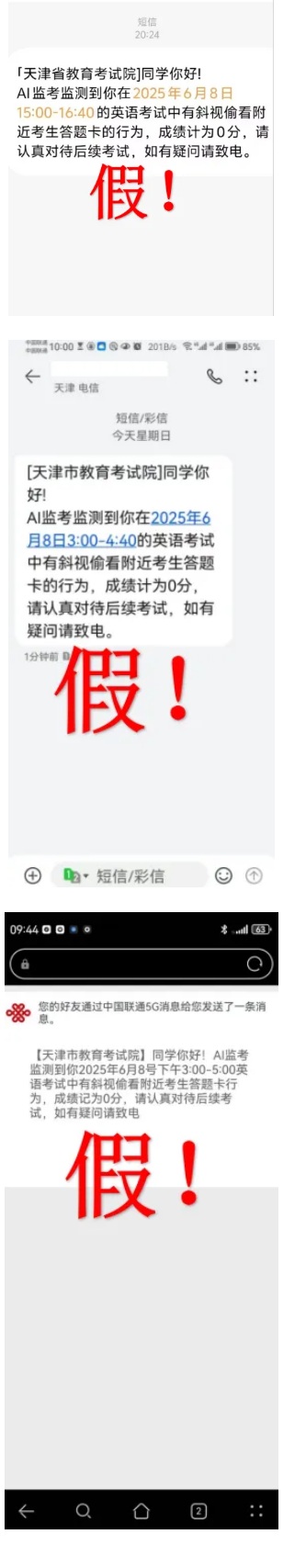 近日,我市部分高考考生收到所謂“天津市教育考試院”的短信,稱“在某某科目考試中被AI監(jiān)考監(jiān)測(cè)發(fā)現(xiàn)其有作弊行為,成績(jī)記為0分!