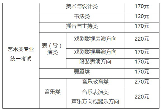 高考大報名和藝術類專業市統考網上報名成功的考生,須于規定時間內(屆時以“上海招考熱線”公告安排為準),通過“上海招考熱線”報名系統支付所選擇的藝術類專業統考項目相應的考試費用(每項藝術類專業統考報名費20元/人,統考的每科目考試費50元/科)。各類收費標準如下: