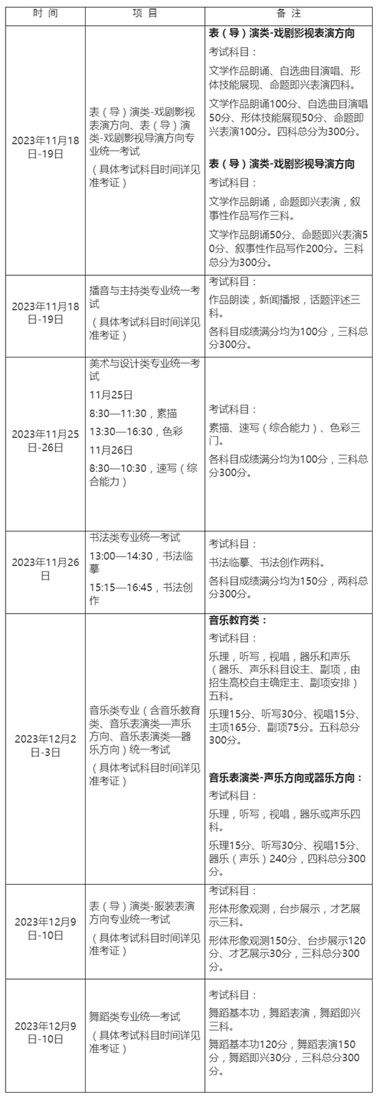 為適應藝術類專業考試招生改革的要求,本市自2024年起藝術類專業統考分六大類別:美術與設計類、書法類、播音與主持類、表(導)演類、舞蹈類、音樂類。在藝術類專業統考報名考試階段,六大類別之間原則上不得兼報(2023年底施考)。