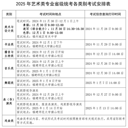 所有考生須在《2025年藝術類專業省級統考各類別考試安排表》規定的時間內,登錄福建省教育考試院網站(www.eeafj.cn)“數字服務大廳--高考高招--藝術類專業省級統考考試信息查詢”系統,查詢并打印本人筆試類科目考試證或面試類科目考試信息,其中音樂類考生還須按規定填報面試應考科目的曲目信息,并按要求參加考試。