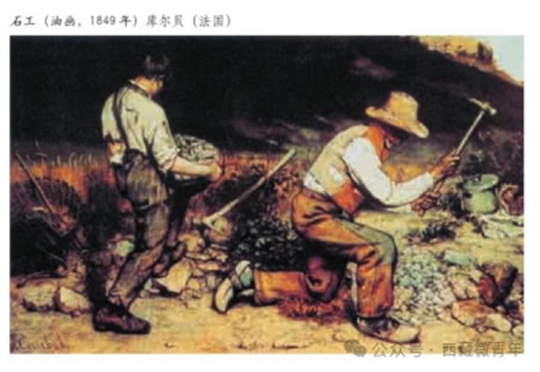 請以法國現實主義畫家庫爾貝的《石工》為構圖和人物造型、道具細節的參考,置換人物身份、服裝、道具及環境,畫一張新版本的《工作的人》。