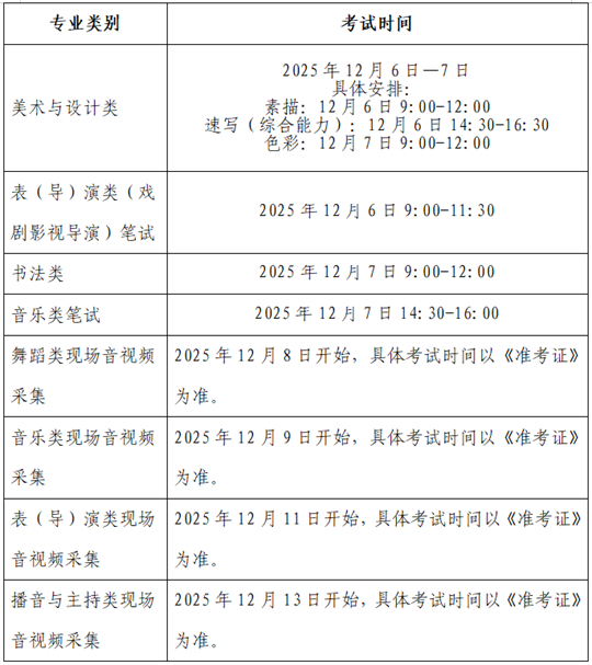 (2)藝術(shù)類專業(yè)省級統(tǒng)考筆試科目安排在2025年12月6日至7日進(jìn)行,現(xiàn)場音視頻采集科目于2025年12月8日開始。具體安排如下表: