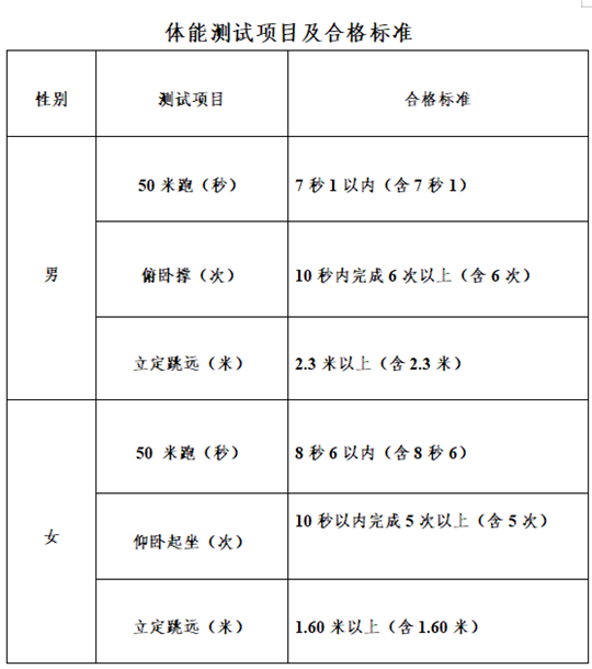 4.體能測試成績合格(三項測試中可以選擇二項進行測試,二項及二項以上合格者視為合格)。