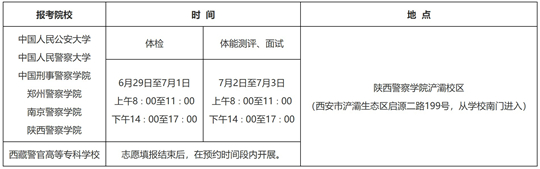參加體檢的考生要提前進(jìn)行預(yù)約。經(jīng)陜西省教育考試院門戶網(wǎng)站公布的報(bào)考公安院校公安本科專業(yè)考生須于6月28日10∶00至17∶00,登錄陜西省公安廳門戶網(wǎng)站掃描二維碼后按要求預(yù)約體檢時(shí)間;經(jīng)陜西省教育考試院門戶網(wǎng)站公布的報(bào)考西藏警官高等專科學(xué)校的考生須于志愿填報(bào)結(jié)束后次日,登錄陜西省公安廳門戶網(wǎng)站掃描二維碼后按要求預(yù)約體檢時(shí)間。預(yù)約成功的考生按預(yù)約時(shí)間,攜帶居民身份證、戶口本、準(zhǔn)考證、《政治考察表》、《2025年陜西省普通高等學(xué)校招生體檢表》(由各縣(區(qū))招生辦負(fù)責(zé)提供復(fù)印件)及《公安院校公安專業(yè)招生考生患病經(jīng)歷申報(bào)表》(附件3,由本人如實(shí)填寫),按流程進(jìn)行體檢、體能測(cè)評(píng)和面試。體檢實(shí)行單項(xiàng)淘汰,體檢合格的考生方可進(jìn)入體能測(cè)評(píng)和面試環(huán)節(jié)。具體時(shí)間及地點(diǎn)安排如下: