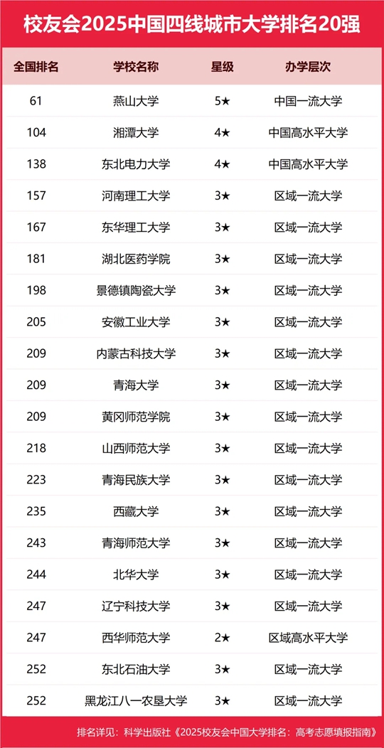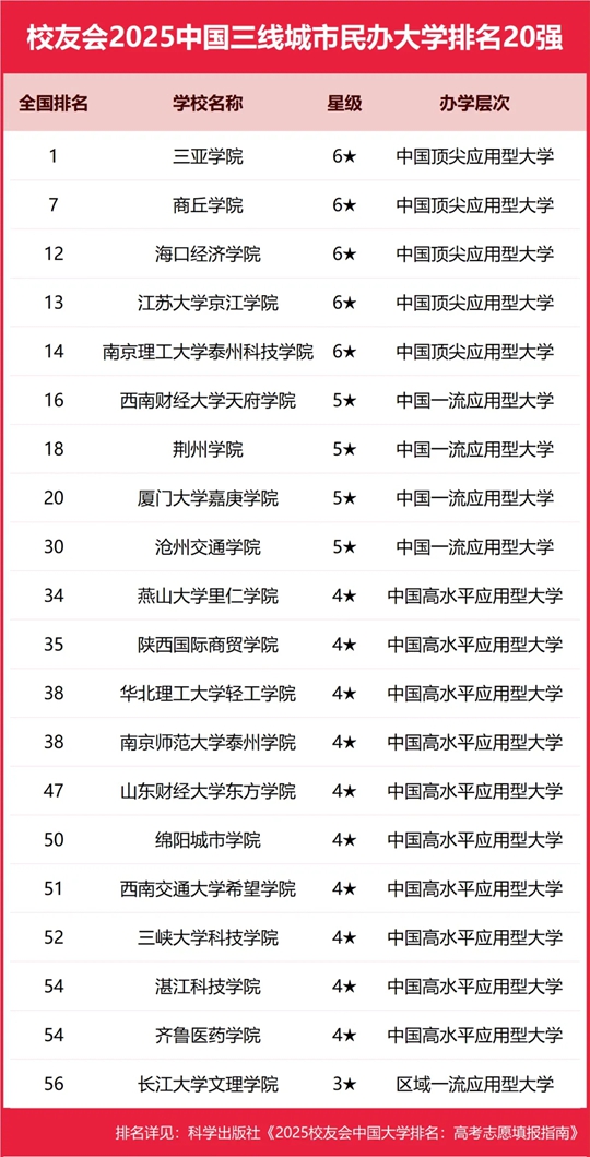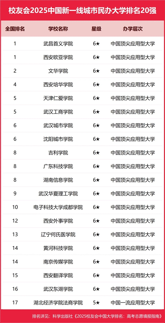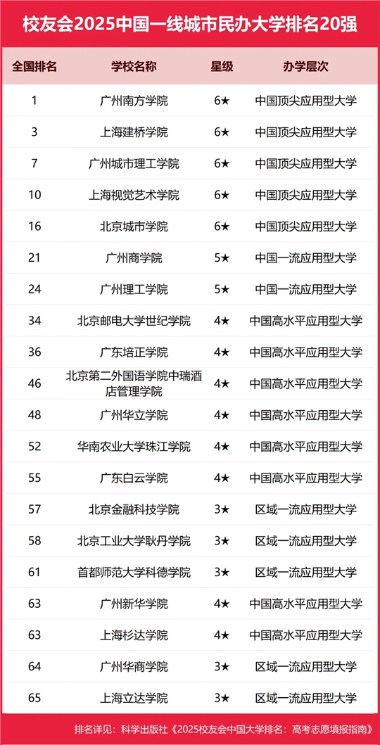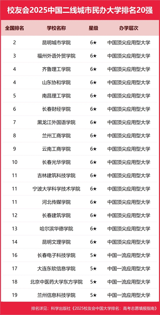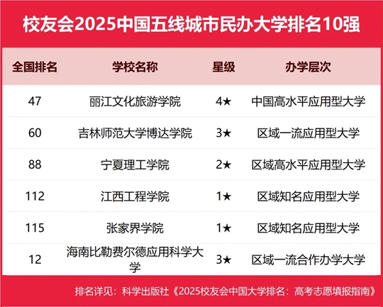 在校友會(huì)2025中國(guó)各線城市民辦大學(xué)排名中,廣州南方學(xué)院、武昌首義學(xué)院、西安歐亞學(xué)院、昆明城市學(xué)院、三亞學(xué)院、四川大學(xué)錦江學(xué)院、麗江文化旅游學(xué)院分列校友會(huì)2025中國(guó)一線城市、新一線城市、二線城市、三線城市、四線城市和五線城市民辦大學(xué)排名第一。