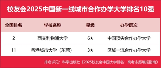 在校友會(huì)2025中國(guó)各線城市合作辦學(xué)大學(xué)排名中,香港中文大學(xué)(深圳)、西交利物浦大學(xué)、北京師范大學(xué)——香港浸會(huì)大學(xué)聯(lián)合國(guó)際學(xué)院、廣東以色列理工學(xué)院、海南比勒費(fèi)爾德應(yīng)用科學(xué)大學(xué)分列校友會(huì)2025中國(guó)一線城市、新一線城市、二線城市、三線城市、四線城市和五線城市合作辦學(xué)大學(xué)排名第一。