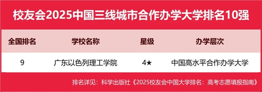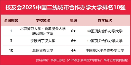 北京師范大學(xué)——香港浸會(huì)大學(xué)聯(lián)合國(guó)際學(xué)院高居2025中國(guó)合作辦學(xué)大學(xué)排名第一。深圳職業(yè)技術(shù)大學(xué)、海南科技職業(yè)大學(xué)名列2025中國(guó)職業(yè)技術(shù)大學(xué)排名冠亞軍。蕪湖職業(yè)技術(shù)學(xué)院、合肥職業(yè)技術(shù)學(xué)院和浙江金融職業(yè)學(xué)院雄居2025中國(guó)高職院校排名第一。