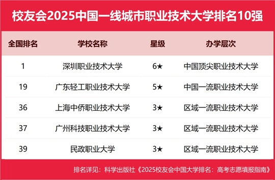 在校友會(huì)2025中國(guó)各線城市職業(yè)技術(shù)大學(xué)排名中,深圳職業(yè)技術(shù)大學(xué)、西安汽車(chē)職業(yè)大學(xué)、河北科技工程職業(yè)技術(shù)大學(xué)、海南科技職業(yè)大學(xué)、山東外國(guó)語(yǔ)職業(yè)技術(shù)大學(xué)、廣西城市職業(yè)大學(xué)分列校友會(huì)2025中國(guó)一線城市、新一線城市、二線城市、三線城市、四線城市和五線城市職業(yè)技術(shù)大排名第一。