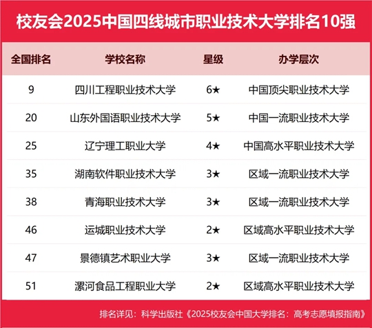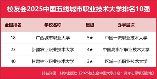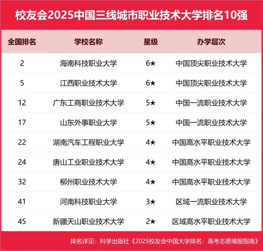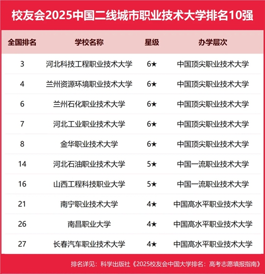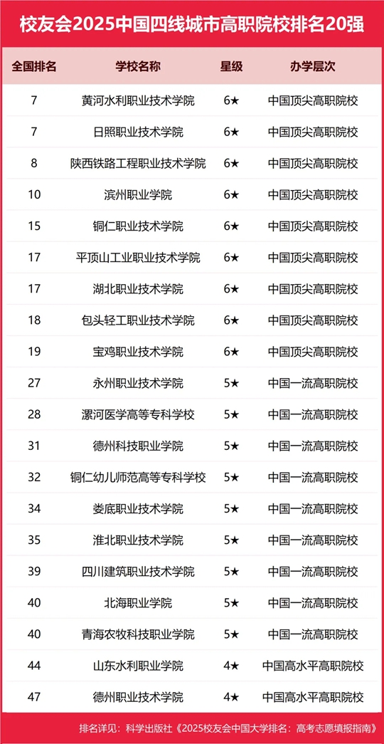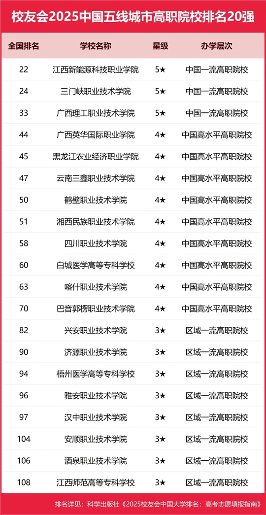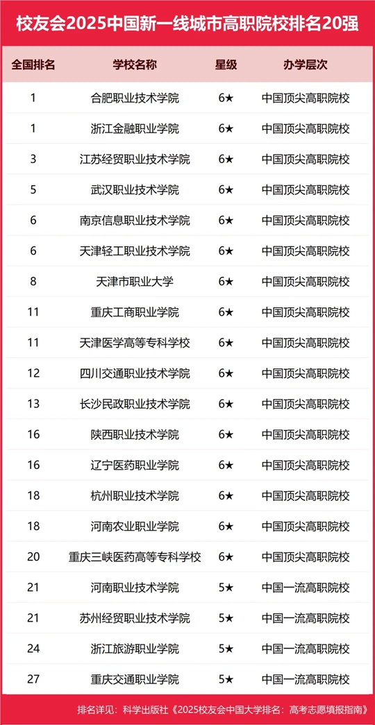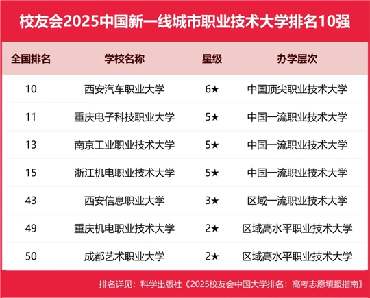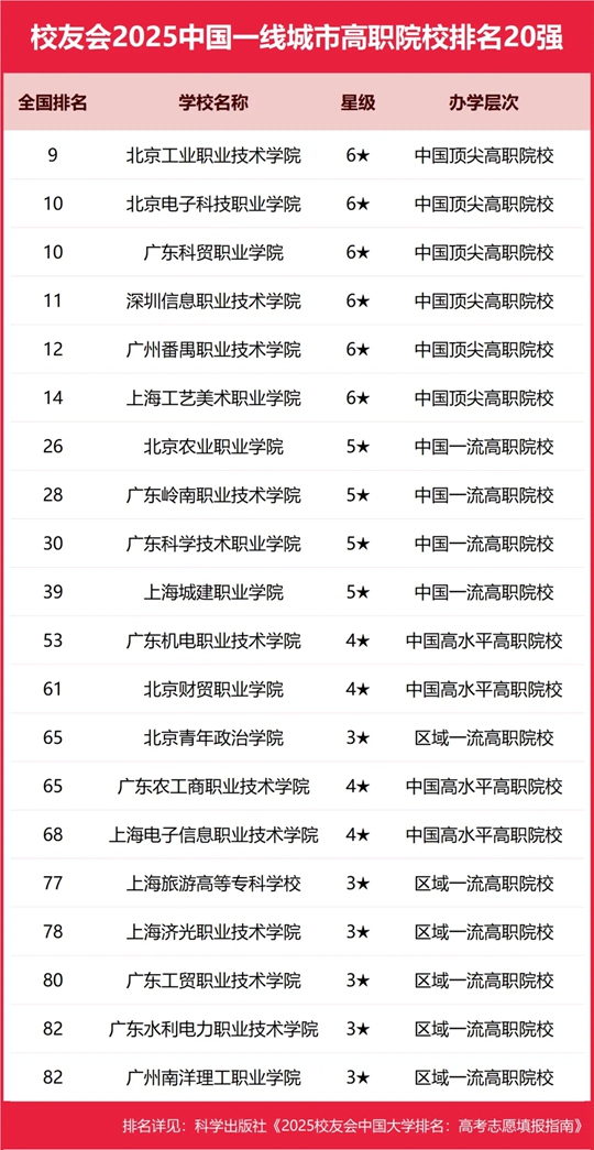 在校友會(huì)2025中國(guó)各線城市高職院校排名中,北京工業(yè)職業(yè)技術(shù)學(xué)院、合肥職業(yè)技術(shù)學(xué)院、浙江金融職業(yè)學(xué)院、寧波職業(yè)技術(shù)學(xué)院、蕪湖職業(yè)技術(shù)學(xué)院、黃河水利職業(yè)技術(shù)學(xué)院、日照職業(yè)技術(shù)學(xué)院、江西新能源科技職業(yè)學(xué)院分列校友會(huì)2025中國(guó)一線城市、新一線城市、二線城市、三線城市、四線城市和五線城市高職院校排名第一。