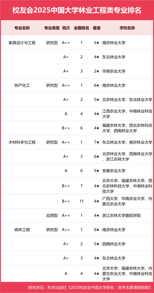 在2025中國大學家具設計與工程專業排名(研究型)中,南京林業大學榮膺2025中國五星級專業(5★),挺進世界知名專業、中國一流專業行列,位列冠軍。