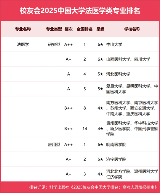 | 校友會(huì)2025中國(guó)大學(xué)法醫(yī)學(xué)類專業(yè)排名,中山大學(xué)、 皖南醫(yī)學(xué)院第一 |