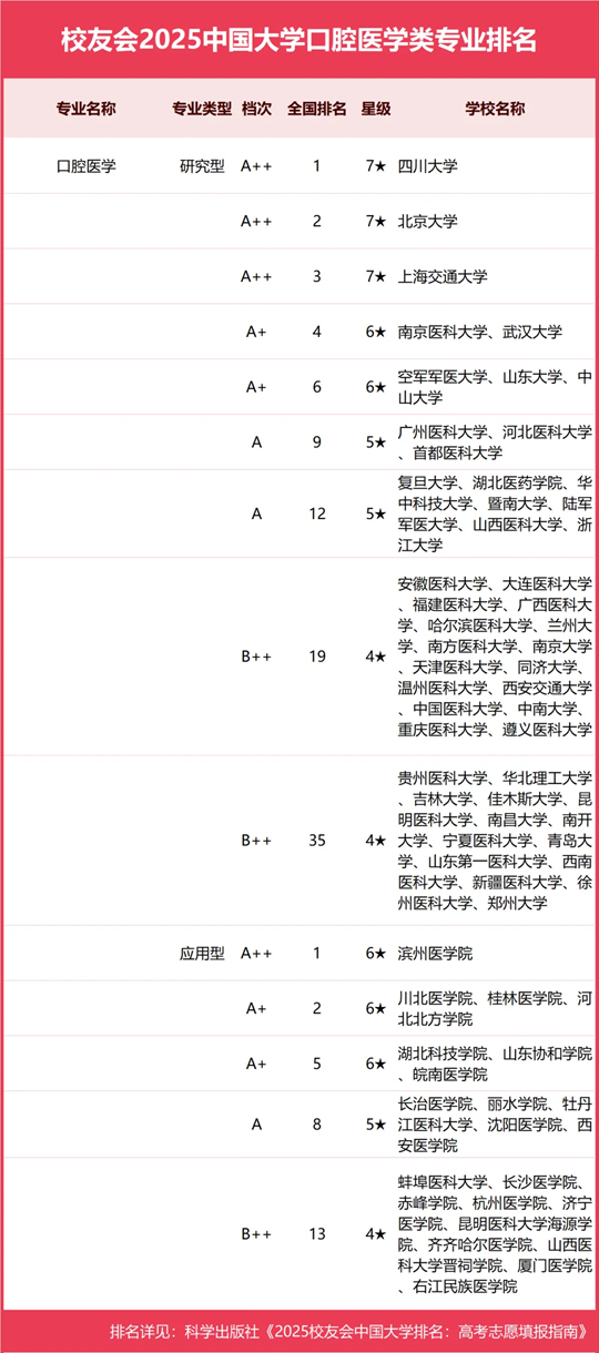 | 校友會2025中國大學口腔醫學類專業排名,四川大學、濱州醫學院第一 |